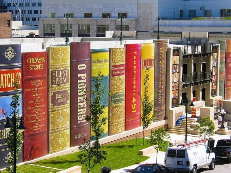 Посредине делового центра города Канзас, штат Миссури, стоит гигантская книжная полка с огромными фолиантами. Что внутри – нетрудно догадаться – Центральная библиотека.  Гигантские книги, каждая из них в высоту достигает семи метров, а в ширину – около двух.