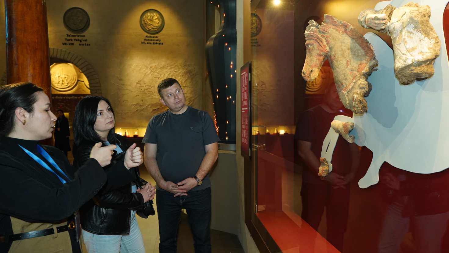 В разделе доисламских цивилизаций внимание делегации привлекла скульптура всадника, обнаруженная в Халчаёне (Сурхандарьинская область) и датируемая I веком до н. э. — I веком н. э. Также гости ознакомились с макетом чигира — водоподъёмного устройства, связанного с Хорезмской цивилизацией. Экспонат демонстрирует высокий уровень развития ирригационных технологий и системы водоуправления региона.