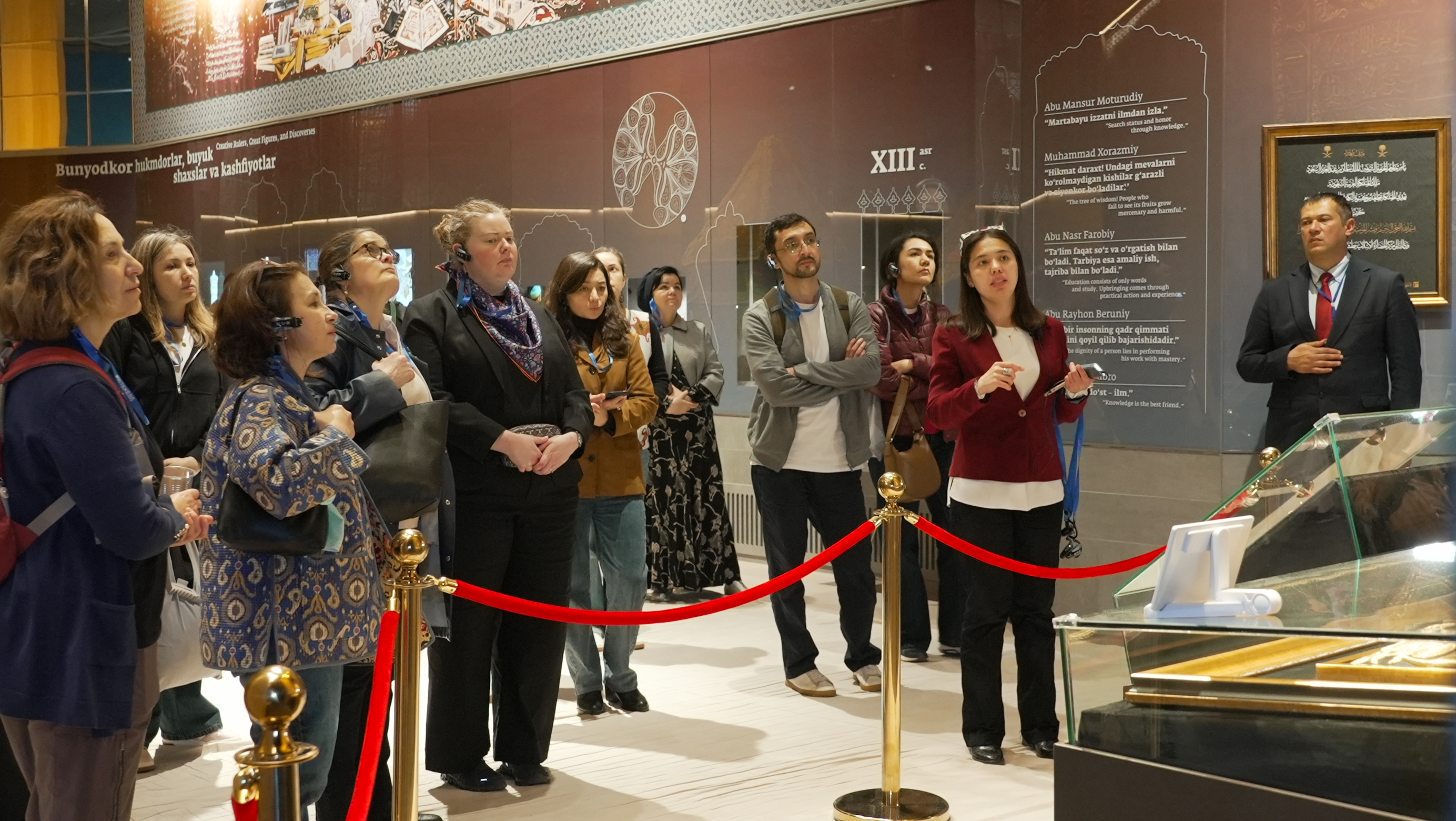 Саёҳат “Буюк сиймолар галереяси”дан бошланди. Бу ерда Биринчи ва Иккинчи Ренессанс даврининг буюк алломалари тасвирлангани делегация вакилларини ҳайратга солди. Қўл меҳнати билан яратилган ушбу композициялар санъат ва тарих уйғунлигининг ноёб намунаси сифатида эътироф этилди.