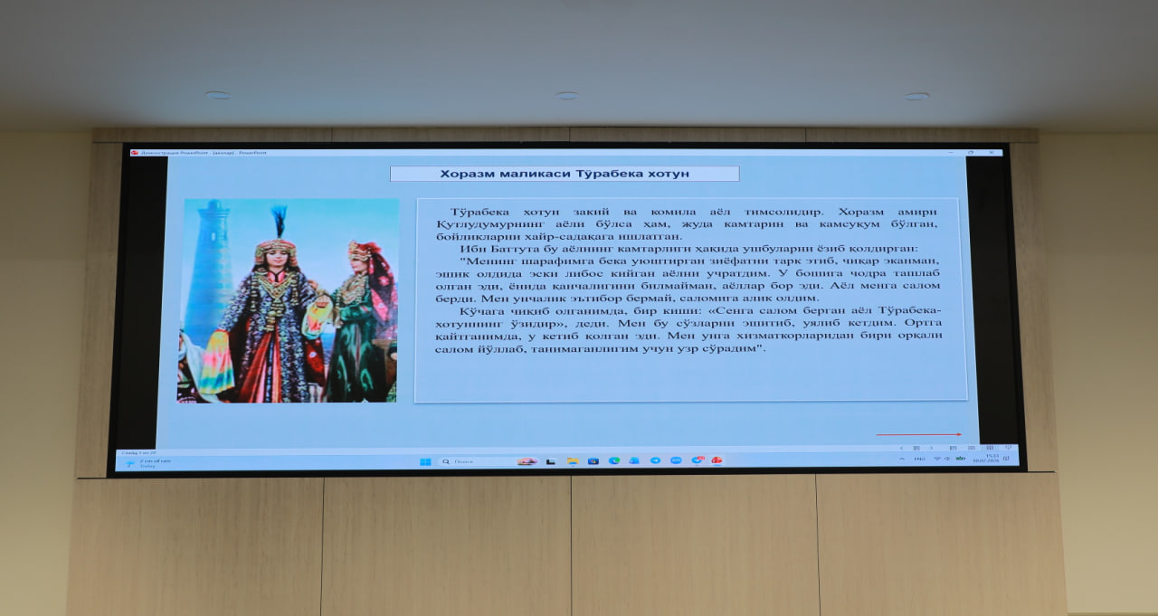 С докладом выступила научный сотрудник Центра Матлуба Рахмонкулова. Она отметила значительную роль женщин в развитии науки, культуры и просвещения в эпоху Второго Ренессанса, представленной в экспозиции Центра. Особое внимание было уделено таким покровительницам науки и образования, как Сароймулкхоним и Гавхаршодбегим, а также учёным и творческим личностям — Зебунисо и Гулбаданбегим. Подчёркивалось, что эти исторические фигуры внесли весомый вклад в духовную и интеллектуальную жизнь общества, инициируя строительство медресе, мечетей и научных центров, а также создавая литературное и научное наследие.