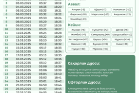 Рамазон тақвими 2025 — саҳарлик ва ифторлик вақтлари