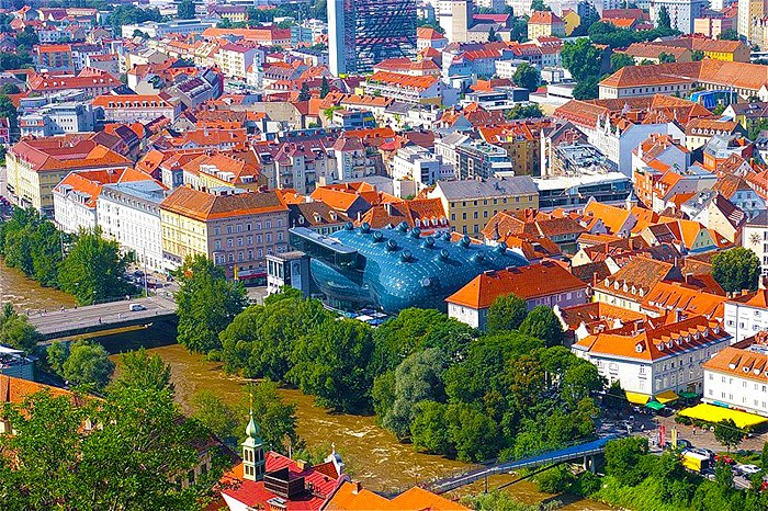 Этот музей-галерея современного искусства в городе Грац Австрии был открыт в рамках программы «Культурная столица Европы» в 2003 году. Концепт здания разработали лондонские архитекторы Питер Кук и Колин Фурнье. Фасад музея выполнен компанией realities:united по технологии BIX как медиа-инсталляция площадью 900 м2, состоящая из светящихся элементов, которую можно программировать с помощью компьютера. Она позволяет музею сообщаться с окружающим городским пространством.