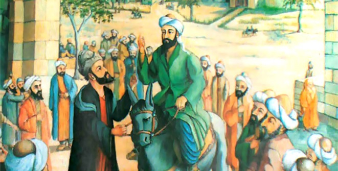 В тот памятный день Руми был снова приглашен на диспут в медресе Пембефурушам. Он проезжал верхом на муле-иноходце, окруженный мюридами и учениками, сопровождавшими его пешком по обе стороны. В толпе прошло волнение и все головы повернулись в одну сторону. — «Едет Мевляна Джалал ад-Дин!» — это имя Шамс услышал впервые лет десять назад в Дамаске. Потом все чаще долетало оно до него, пока не позвало его в путь.