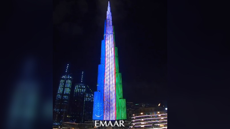 Самое высокое здание мира «Бурдж Халифа» окрасилось в цвета флага Узбекистана